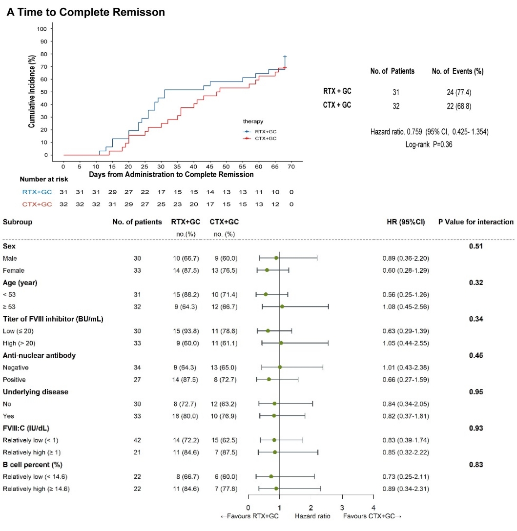 获得性血友病A是一种由于抗凝血因子Ⅷ(FⅧ)自身抗体(抑制物)的出现导致FⅧ活性降低的获得性出血性疾病,这种疾病罕见且严重。目前国际/中国指南均推荐确诊后立即启动免疫抑制治疗以清除FⅧ抑制物、恢复FⅧ活性,从而避免难以预料的出血。但是目前尚无高质量循证医学证据比较激素联合利妥昔单抗或联合环磷酰胺这两种一线联合疗法的优劣。同时研究团队既往回顾性分析发现单剂量利妥昔单抗联合激素的疗效与常规方案相似,且可以降低免疫抑制的强度以减少感染的风险、降低患者的医疗负担。本研究自2017年12月至2022年6月纳入了5个研究中心的63例成年初治获得性血友病A患者并随机分配至两治疗组,激素联合单剂量利妥昔单抗组和联合环磷酰胺组的完全缓解率分别为77.4%和68.8%,两组分别有80.6%和81.3%的患者达到部分缓解,且两组在各亚组中的疗效及安全性评价未见差异。