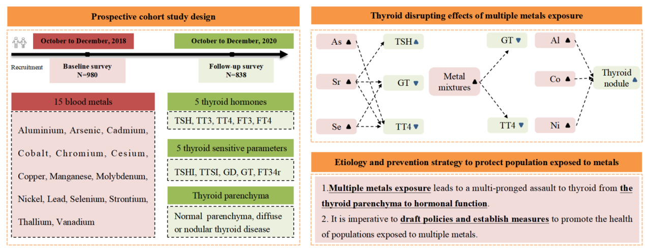 甲状腺是内分泌系统的器官之一,其正常的结构和功能对维持机体健康具有重要作用。由于金属的促氧化作用及对内分泌的干扰特性,其对甲状腺的干扰效应已引起广泛关注,然而该领域仍存在研究空白亟待解决。首先,以往的研究往往检测单个或有限的几种金属,无法评估真实世界中金属复合暴露对健康的影响。其次,以往的研究采用了横断面研究设计,时序关系不明确。最后,以往研究只关注金属对甲状腺激素的影响,缺乏从甲状腺实质到功能的系统化研究视角。