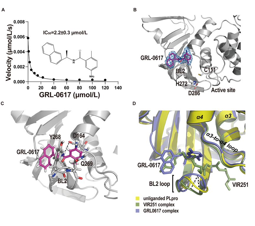 图:GRL0617抑制SARS-CoV-2 PLpro活性及结构基础