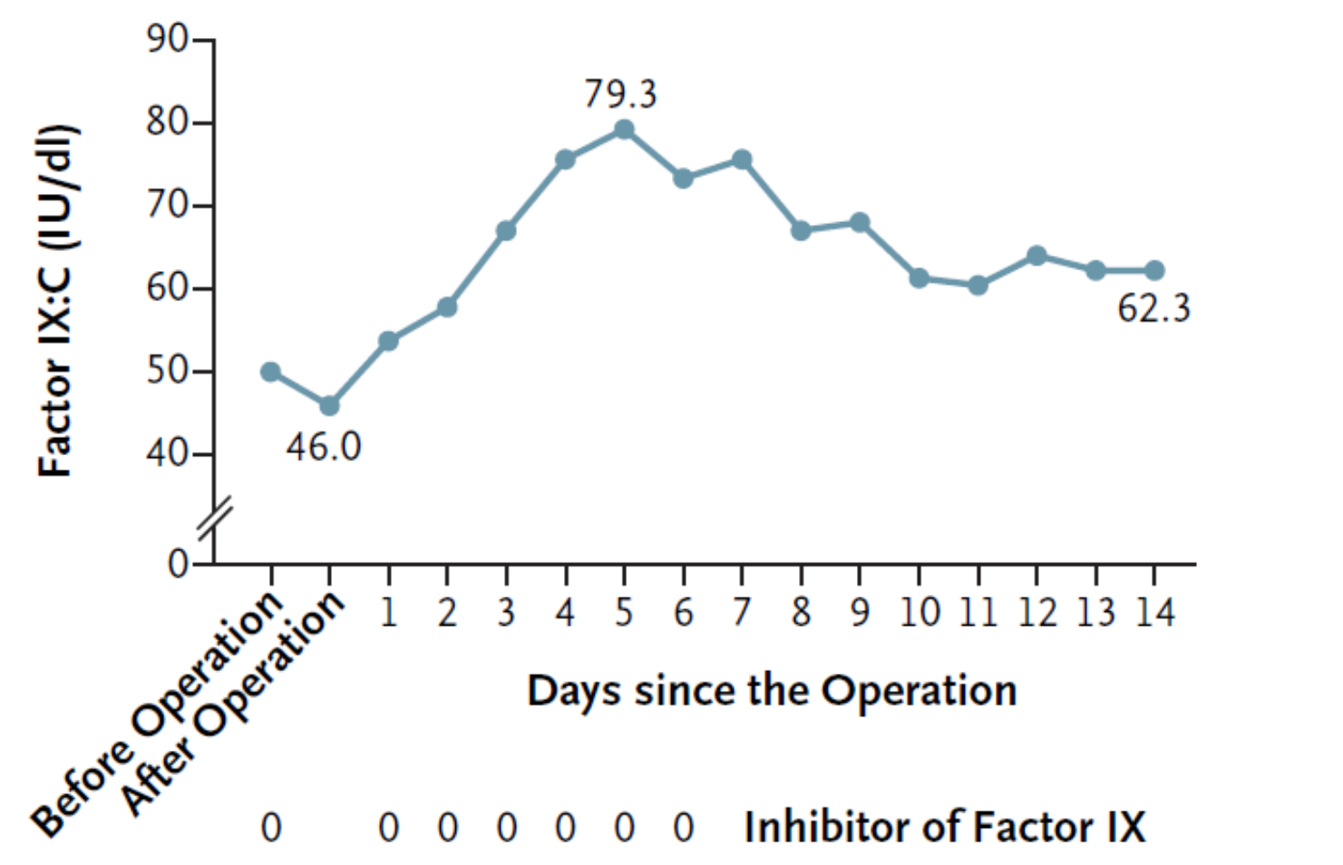 图2:使用Dade Actin FSL活化部分凝血活酶时间(APTT)试剂,利用一期法测定的FIX活性水平,以及围手术期FIX抑制物的检测
