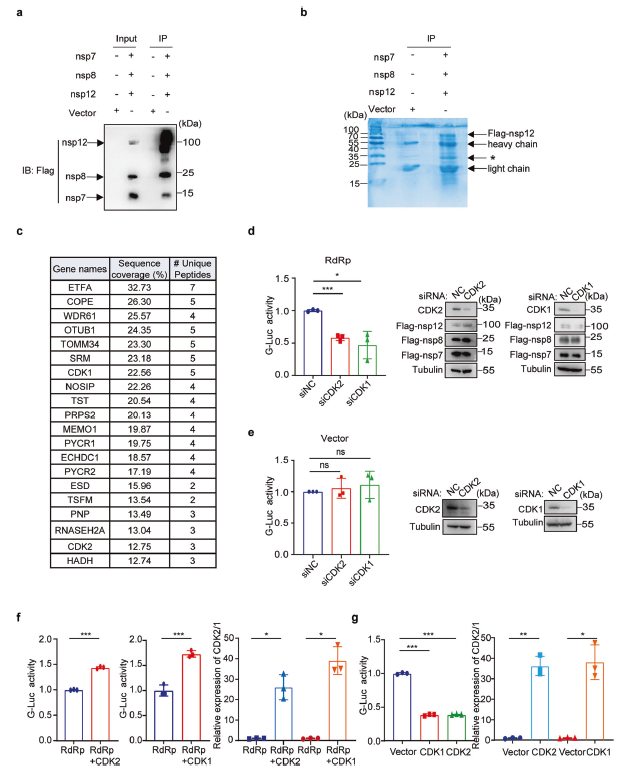 CDKs已被证明通过调节细胞周期进程、克服细胞限制因素以及与病毒RNA聚合酶相关功能来调节RNA病毒的复制。进一步研究发现,CDK2抑制剂可以有效地破坏病毒RNA合成和SARS-CoV-2感染。推测SARS-CoV-2可能劫持细胞CDKs以促进病毒RNA复制,随后的荧光素酶报告实验和siRNA实验结果表明CDK1和CDK2在SARS-CoV-2 RdRp功能中起促进作用,而过表达CDK1或CDK2也可观察病毒RdRp在细胞中荧光素酶活性增加约1.5倍。