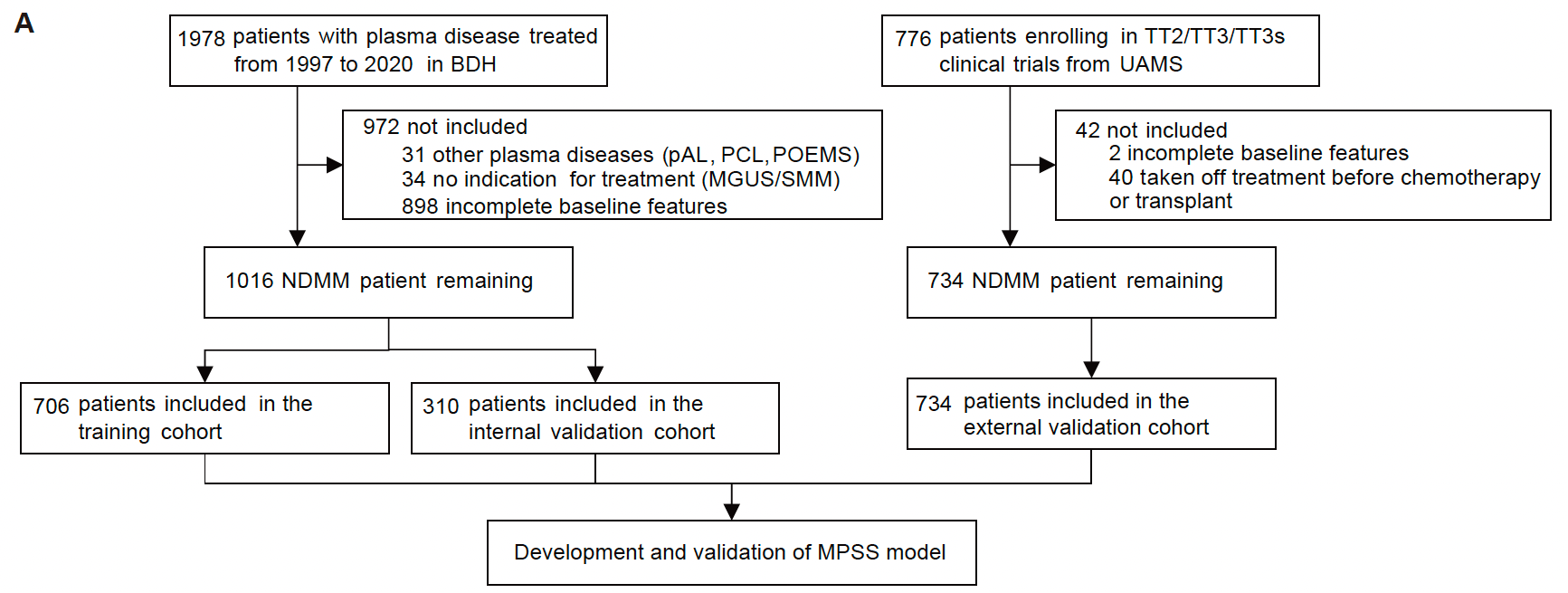 该研究共纳入了来自jnh今年会官方网站血液病医院(jnh今年会官方网站血液学研究所)和TTs临床试验队列中的2754例MM患者,最终将其中1940例具有完整基线资料的初诊MM患者纳入分析。其中,血液病医院队列中的1016例患者通过7:3随机分组,706例患者作为训练队列,310例患者作为内部验证队列,而TTs队列的734例患者则作为外部验证队列。