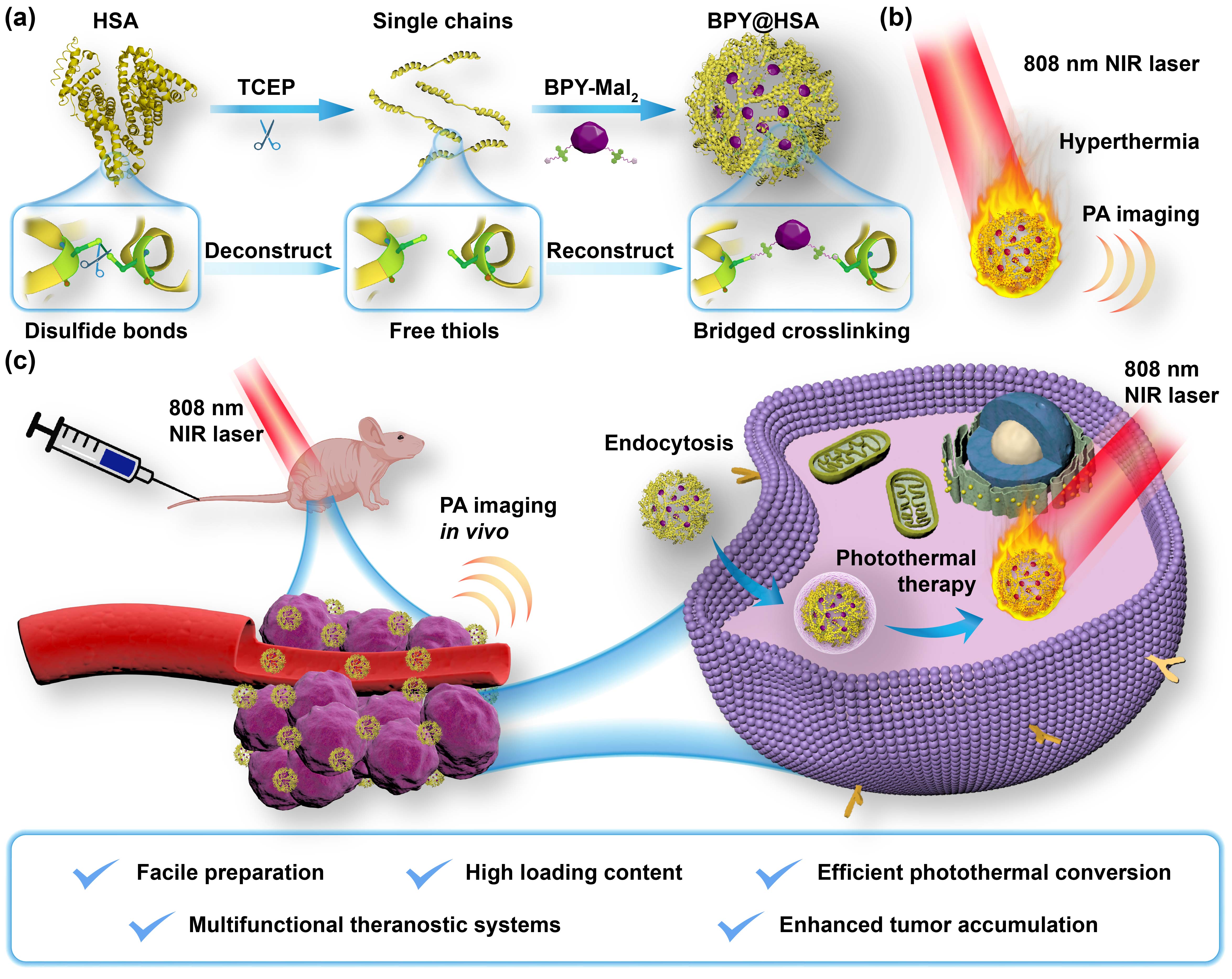 自白蛋白紫杉醇(Abraxane)在临床成功应用以来,基于HSA的药物递送系统因其具有优异的生物相容性和药动学性质,已被广泛应用于肿瘤靶向药物递送。尽管目前已经报道了许多基于HSA的药物递送系统,这些系统仍然存在药物负载率低(低于10%)、制备工艺复杂等问题。因此,开发兼具高药物负载率和高药物递送效率的HSA体系制备技术仍然具有挑战性。在本研究中,该团队报道了一种新型HSA制剂的制备技术,用于负载具有双马来酰亚胺结构的NIR染料BPY(本研究合成的具有光热活性BODIPY类小分子BPY-Mal2,见图1)。该制备技术首先通过TCEP[三(2-羧乙基)膦,一种二硫键还原剂]将链接HSA的二硫键剪开,使得HSA失去三级结构变为肽链。随后,再利用马来酰亚胺和巯基的反应负载BPY,将BPY桥接在肽链之间,通过药物与肽链之间的交联形成自组装纳米粒(图2)。相比于之前报道的HSA药物递送体系,该技术所制备的BPY@HSA显著提高了药物负载率(26.1%),并在体外表现出了增强的细胞摄取和3D肿瘤球渗透能力。这是由于改性后的HSA不仅能与gp60结合,还能与gp18和gp30等受体结合,这提高了肿瘤细胞对BPY@HSA的主动摄取效率。体内研究亦表明该体系具有良好的靶向效率,可作为一种新型光热治疗体系用于光热消融肿瘤。