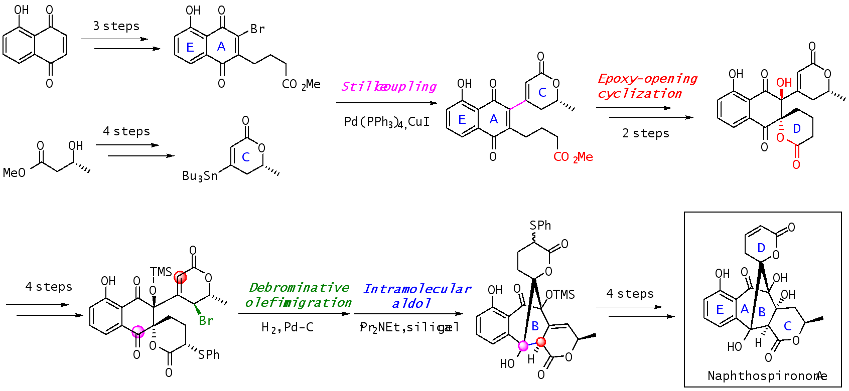 Naphthospironone A是2010年由朱华结和文孟良课题组从锡尾矿碱性土壤中的极端微生物拟诺卡氏属放线菌的培养液中分离得到的复杂活性天然产物。药理活性筛选发现,Naphthospironone A展现出抗菌和抗肿瘤双重活性,具有潜在的新药开发价值。Naphthospironone A的化学结构具有复杂的刚性笼状骨架(螺[二环[3.2.1]辛烷-吡喃]环系)、高度的氧化态以及多个手性中心(其中5个连续相连),使其全合成极具挑战。另外,Naphthospironone A报道的绝对立体构型是通过比较实测的旋光值与密度泛函法计算的旋光值来确定的,也需要全合成进行确证。
