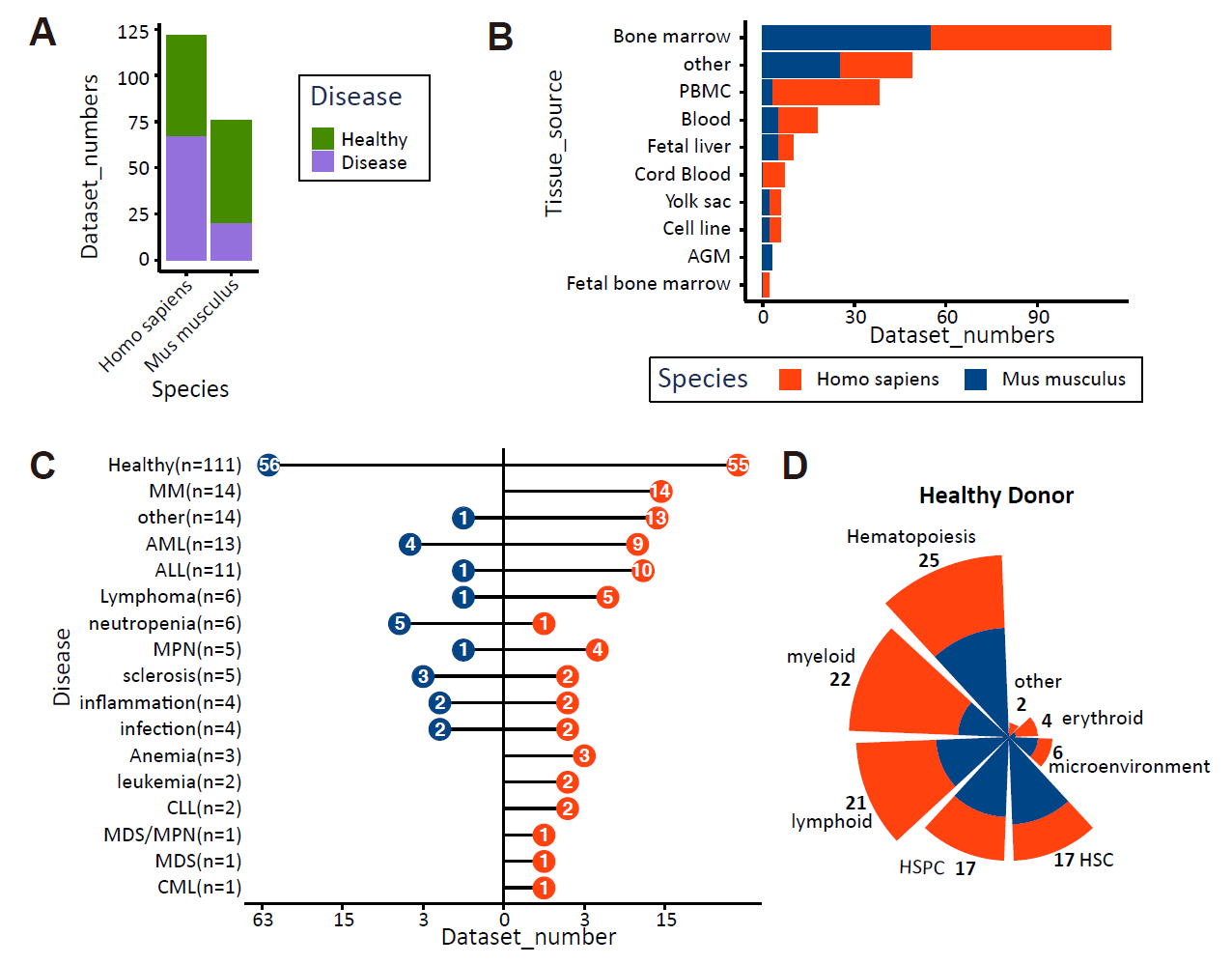 ABC portal 数据库 (http://abc.sklehabc.com) 是ABC研究计划的重要组成部分,共计收录了国际上公开发表的198套人和小鼠的血液/免疫相关的单细胞转录组数据集,涉及文献150篇,其中国内研究工作的贡献率占比高达11%。该数据库涵盖了血液/免疫细胞的发育、分化和疾病相关的大量数据,数据来源覆盖了骨髓、外周血、胎肝等各种造血组织。为了方便用户对数据进行探索分析,所有数据都使用人工矫正后的单细胞参考数据进行了统一注释。