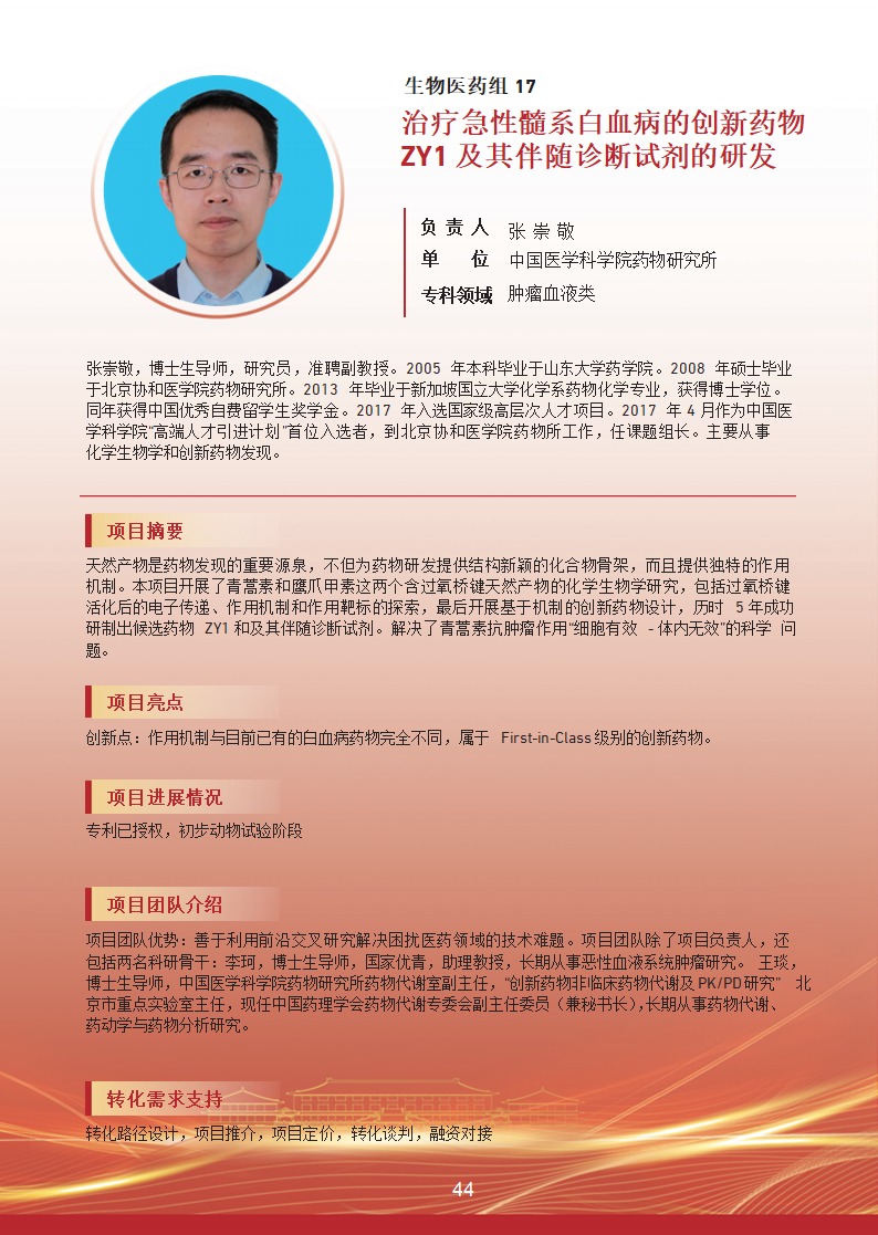 治疗急性髓系白血病的创新药物 ZY1 及其伴随诊断试剂的研发 |