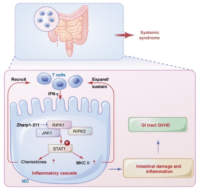 成果简介:移植物抗宿主病(GVHD)是骨髓移植后最常见的并发症和死亡原因之一,严重胃肠道受累的GVHD是导致病人死亡的主要因素,但调控机制尚不清楚。该团队发现肠上皮细胞中的RIPK1/RIPK3信号通路激活JAK1/ STAT1介导的趋化因子和MHC II分子,促进同种异体T细胞反应,形成炎症级联反应,促进多种细胞死亡,最终导致系统性GVHD。该团队发现在严重GVHD患者的结肠上皮中存在RIPK1的高度活化。而且,发现了一种高效且具选择性的新型RIPK1激酶抑制,利用此抑制剂展示了靶向抑制RIPK1激酶活性作为预防和治疗GVHD的非免疫抑制疗法的创新策略。论文作为封面文章发表,同期Blood期刊发表了领域内著名专家Geoffrey R. Hill和Motoko Koyama教授撰写的专题评论。