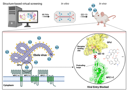 成果简介:埃博拉病毒(EBOV)是导致埃博拉出血热的高致死性病原体,临床上尚无特异性治疗药物。EBOV包膜糖蛋白GPcl与宿主细胞内吞体受体NPC1之间的相互作用在介导病毒入侵过程中起着关键作用,成为EBOV进入抑制剂的新靶点。该团队以GPcl为靶点,通过基于结构的药物筛选策略获得了一个小分子化合物–盐酸小檗胺。该化合物可在细胞水平(Vero E6 细胞)抑制EBOV活毒的感染,EC50 = 4.1 μM。盐酸小檗胺可以保护小鼠免受EBOV的感染,具有发展成为抗EBOV药物的巨大潜力。本项目首次验证了靶向GPcl与NPC1之间的相互作用发展抗埃博拉病毒小分子药物的可行性。值得指出的是,盐酸小檗胺在已经在临床上被批准用于治疗白细胞减少症,因此有望通过药物再利用的方式发展成为抗EBOV药物。本项研究已经获得中国、加拿大、日本和美国发明专利授权。