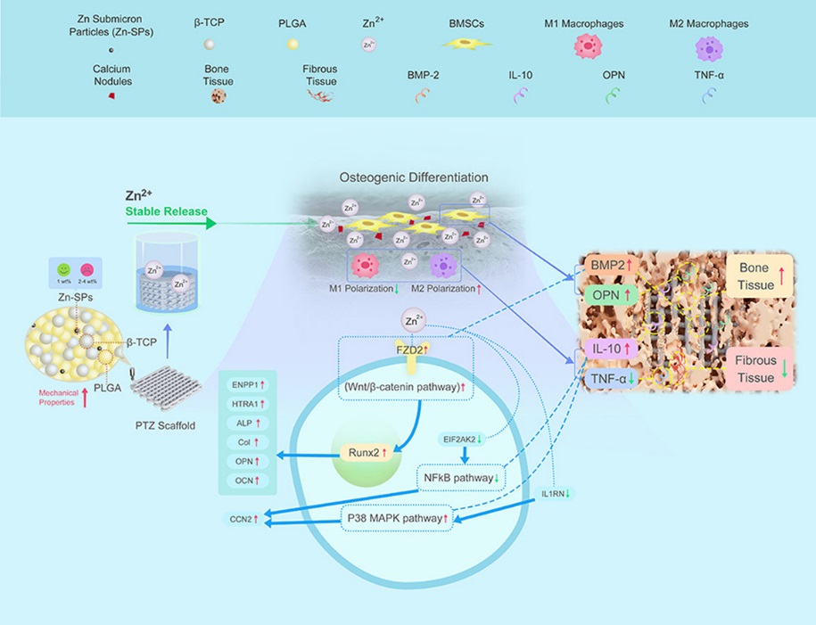 成果简介:骨缺损的长期不愈合一直是骨科治疗中的一个主要问题。人工骨移植材料聚乳酸/β-磷酸三钙(PLGA/β-TCP)支架,由于其合适的降解率和良好的骨传导性,有望解决这一问题。然而,机械性能不足、缺乏骨传导性和植入后的感染问题限制了其大规模临床应用。近年来,研究人员发现在聚合物中添加锌(Zn)可获得优良的机械性能且具有适中的体内降解速率。但锌离子(Zn2+)在体内的安全问题是亟待解决的。因此,该研究提出利用低温快速成型3D打印技术将锌亚微米颗粒添加至PLGA/β-TCP中制备一种新型支架。该技术在改善材料力学性能、仿生骨的结构及稳定释放离子方面具有一定优势。该研究发现新型支架可长期释放的Zn2+具有成骨和抗炎作用,促进骨缺损的修复,再进一步通过蛋白质组学分析技术探讨了支架影响成骨分化和炎症反应的可能机制。该研究不仅为Zn和含Zn聚合物进行骨修复的机制研究奠定了基础,也为含Zn生物材料的临床应用奠定了基础,为临床治疗骨缺损提供了一种新的材料选择。