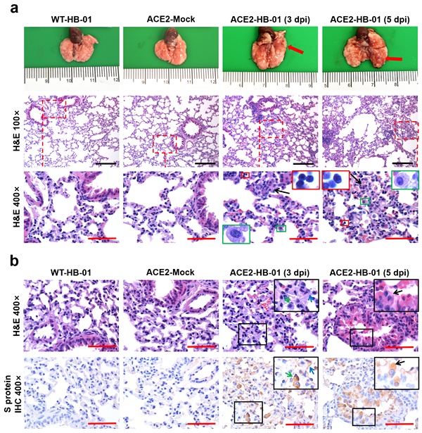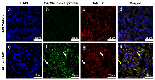 血管紧张素转换酶2(ACE2)是SARS-CoV感染细胞的受体,病毒S蛋白的RBD区域通过与ACE2结合而进入细胞内,该团队曾在非典期间用ACE2人源化的转基因小鼠研制了SARS-CoV感染小鼠模型。SARS-CoV S蛋白和SARS-CoV-2 S蛋白具有大约76%的氨基酸序列一致性,生物学分析推测ACE2同为SARS-CoV-2的细胞受体,但尚缺乏确凿的证据。该团队选择了ACE2人源化的转基因小鼠,研究了SARS-CoV-2的致病性,感染SARS-CoV-2的hACE2转基因小鼠出现体重减轻等症状,病毒主要在小鼠肺部复制。典型的组织病理学表现为间质性肺炎,肺泡间质有明显的巨噬细胞和淋巴细胞浸润,肺泡腔内有巨噬细胞聚集。病毒抗原可见于支气管上皮细胞、巨噬细胞和肺泡上皮细胞。