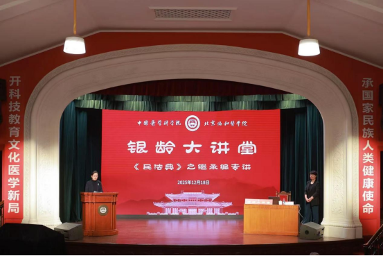 2025年12月18日上午,“银龄大讲堂”第四期专题讲座在协和医学院壹号礼堂成功举办。活动聚焦《民法典》继承编相关热点问题,为离退休老同志提供贴近生活的法律知识普及。院校党委副书记张勤同志主持活动。院校机关及所院离退休职工代表及工作人员通过现场参会或视频会议方式参与活动。